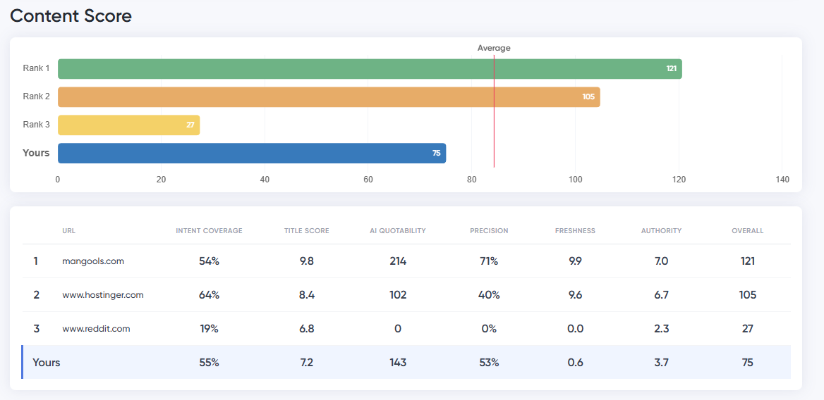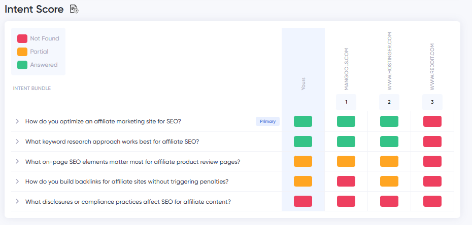 The Intent Score analyzes how well the page matches the intent of the keyword. Five questions are generated, along with a score indicating how well the page covers the answer to each question by comparing your page with the top three competitors.