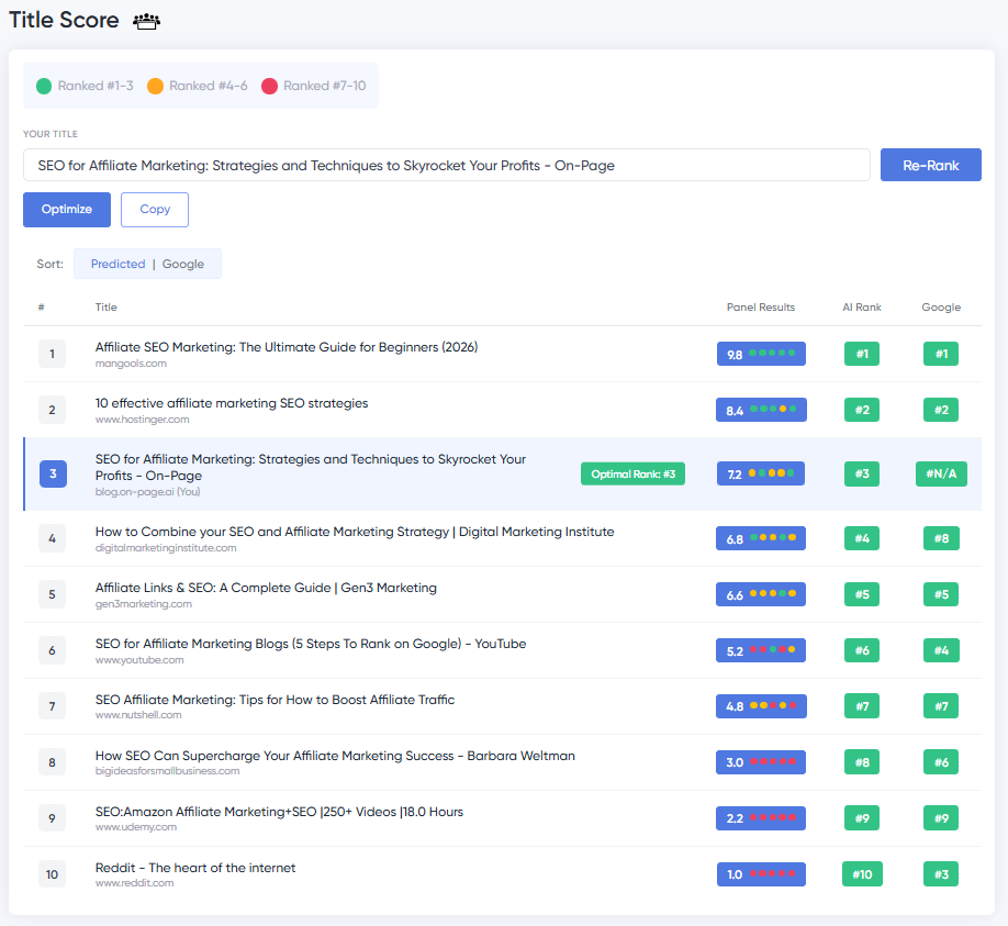The list shows the top 10 titles and can be sorted based on predicted AI rank or Google results. It displays the individual results from each panel judge, as well as the AI ranking and the Google ranking.