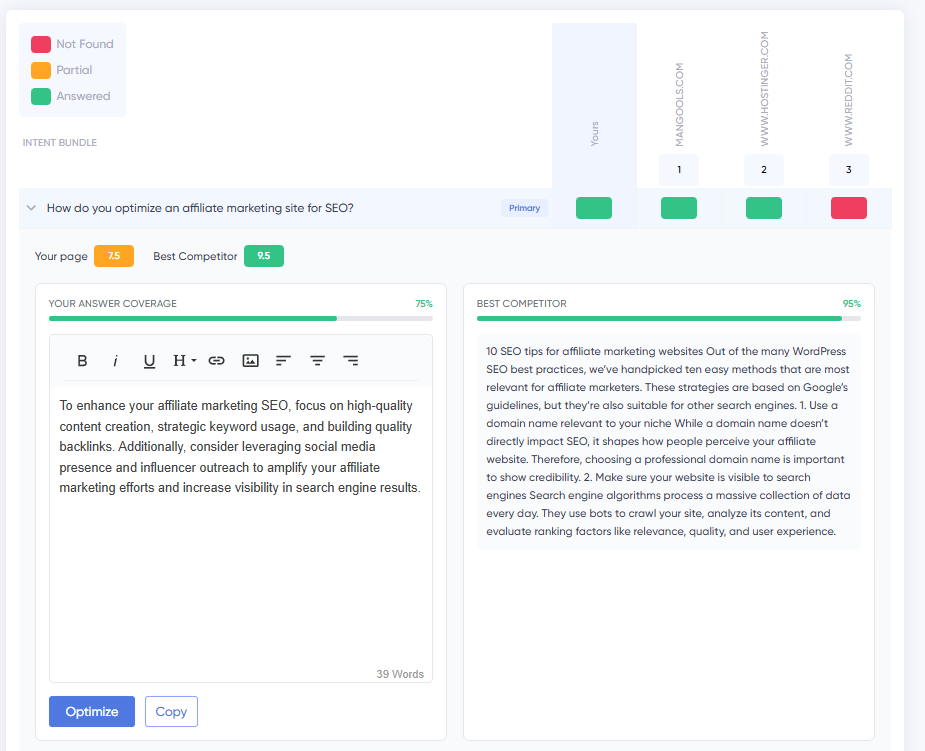 Clicking on a question will expand the module, showing details of the answers being compared. You can follow up by clicking the Optimize button, which will automatically enhance the text to cover the answer better.