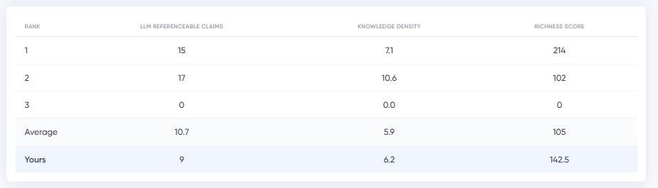 - LLM REFERENCEABLE CLAIMS: The raw number of potential citations that can be taken by an LLM (Large Language Model).