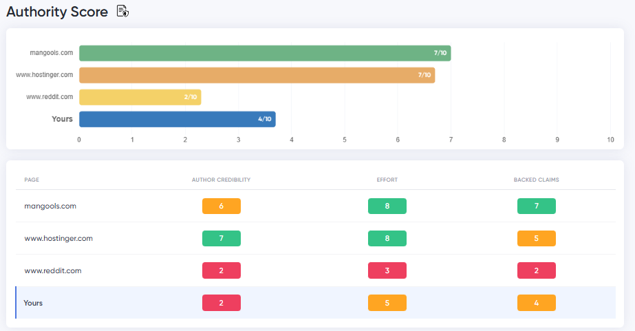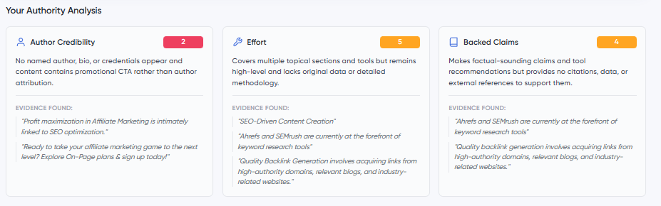 Next is a detailed authority analysis, where the three evaluated aspects are expanded with parameters and evidence.