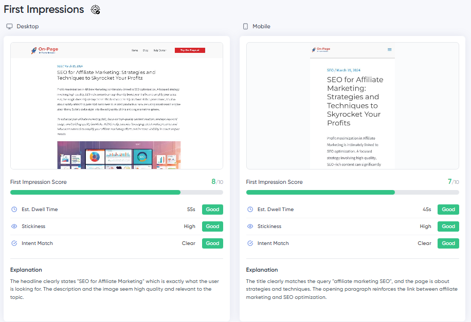 The chart provides a screenshot of what is seen when the page is opened, along with the First Impression Score and scores for Estimated Dwell Time, Stickiness and Intent Match. At the end, there is a brief explanation of how the page is perceived by a user when it is opened.